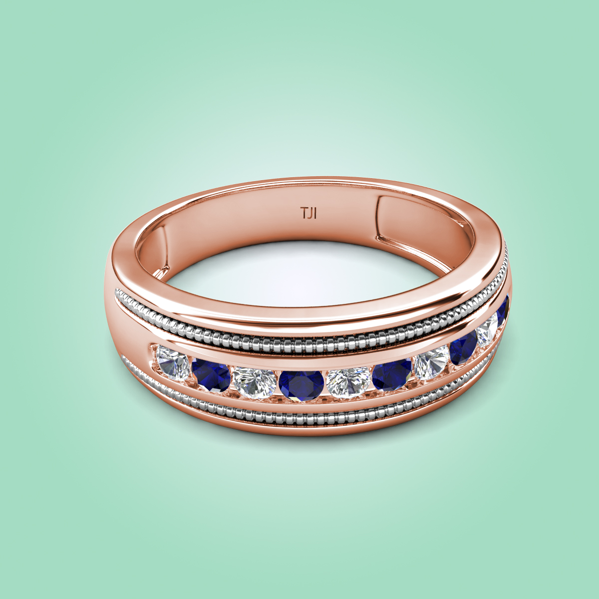 This two toned style with high polished finished edges with twisted wire effect is the best wedding band of 0.55 ctw with Round Natural Diamond and Blue Sapphire set in a Channel setting.
