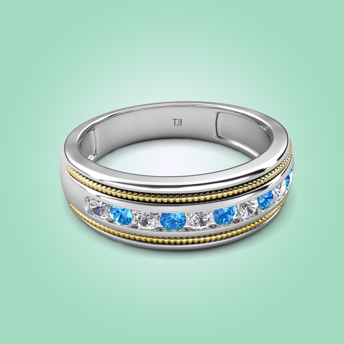 This two toned style with high polished finished edges with twisted wire effect is the best wedding band of 0.50 ctw with Round Natural Diamond and Blue Topaz set in a Channel setting.