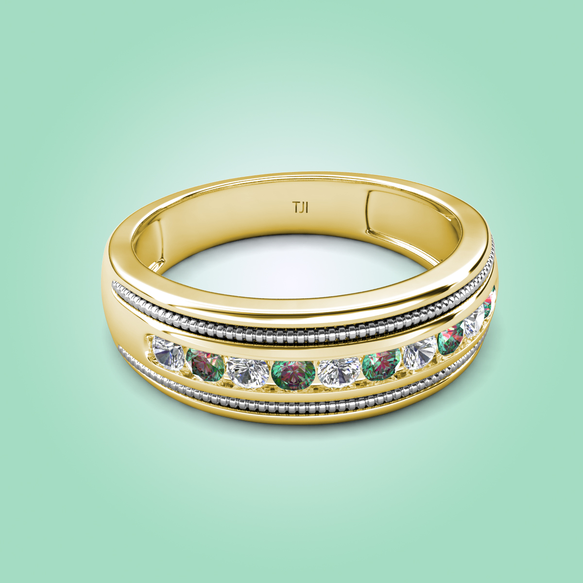 0.59 ctw Round Natural Diamond (2.40 mm) and Created Alexandrite (2.40 mm) Two Toned and High Polished Edges Men Wedding Band in 10K Yellow Gold More Details ...