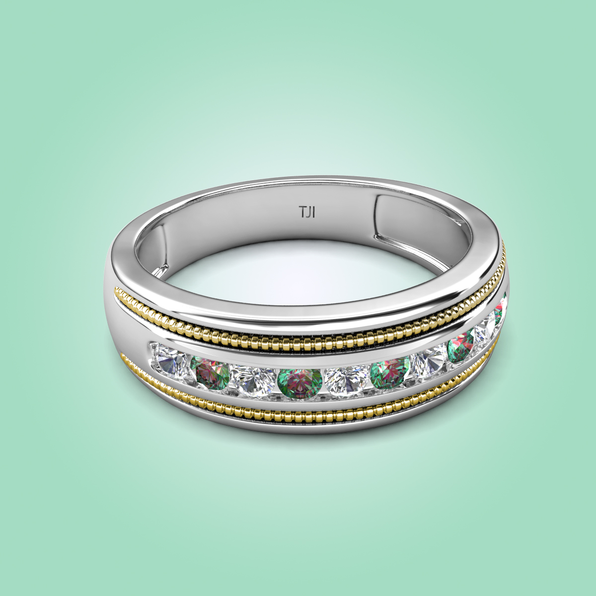This two toned style with high polished finished edges with twisted wire effect is the best wedding band of 0.59 ctw with Round Natural Diamond and Created Alexandrite set in a Channel setting.
