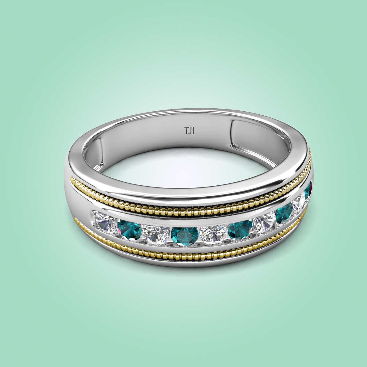 This two toned style with high polished finished edges with twisted wire effect is the best wedding band of 0.53 ctw with Round Natural Diamond and London Blue Topaz set in a Channel setting.