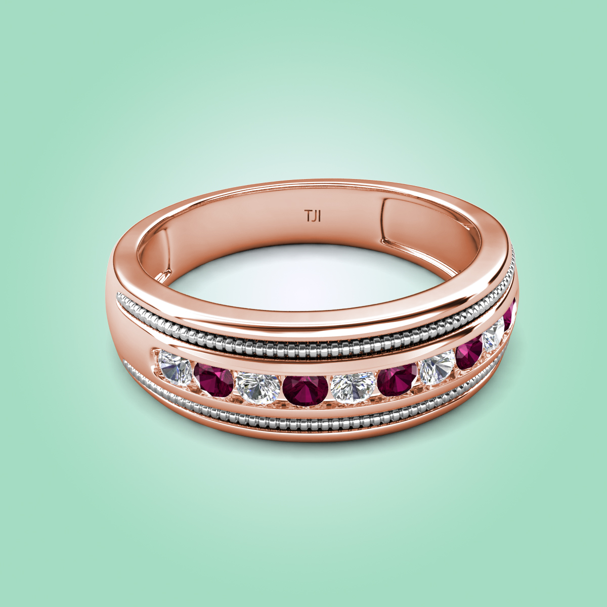 This two toned style with high polished finished edges with twisted wire effect is the best wedding band of 0.59 ctw with Round Natural Diamond and Rhodolite Garnet set in a Channel setting.