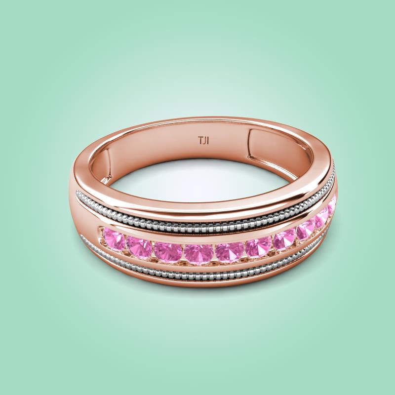 This two toned style with high polished finished edges with twisted wire effect is the best wedding band of 0.55 ctw and Round Pink Sapphire set in a Channel setting.