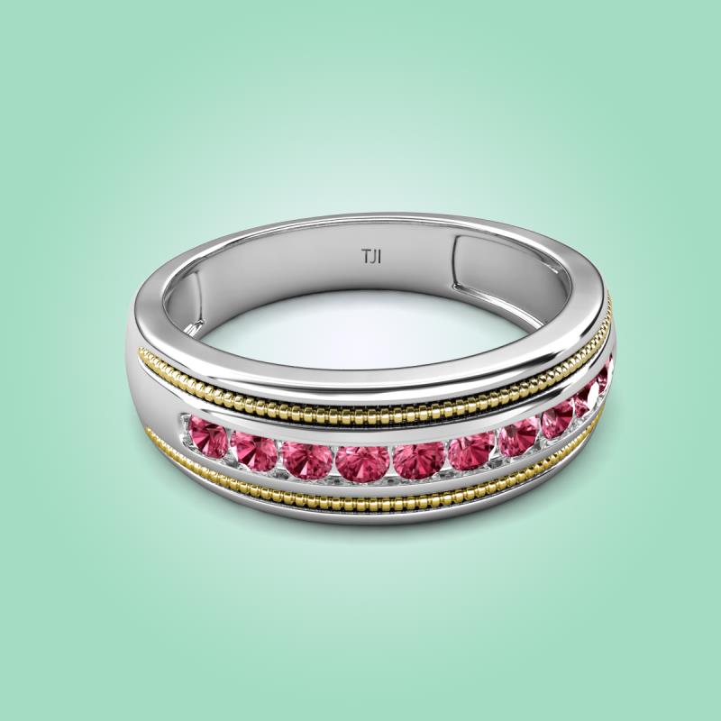 This two toned style with high polished finished edges with twisted wire effect is the best wedding band of 0.35 ctw and Round Pink Tourmaline set in a Channel setting.