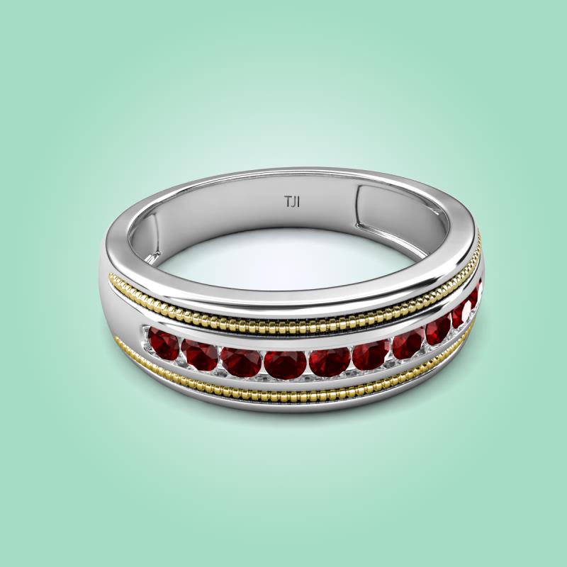 This two toned style with high polished finished edges with twisted wire effect is the best wedding band of 0.63 ctw and Round Red Garnet set in a Channel setting.