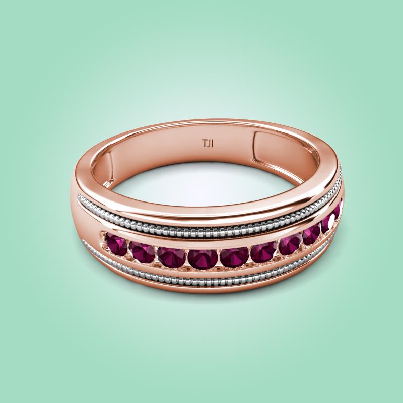 This two toned style with high polished finished edges with twisted wire effect is the best wedding band of 0.63 ctw and Round Rhodolite Garnet set in a Channel setting.