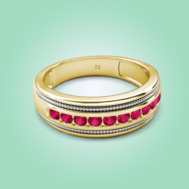 This two toned style with high polished finished edges with twisted wire effect is the best wedding band of 0.55 ctw and Round Ruby set in a Channel setting.