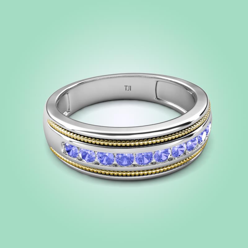 This two toned style with high polished finished edges with twisted wire effect is the best wedding band of 0.50 ctw and Round Tanzanite set in a Channel setting.