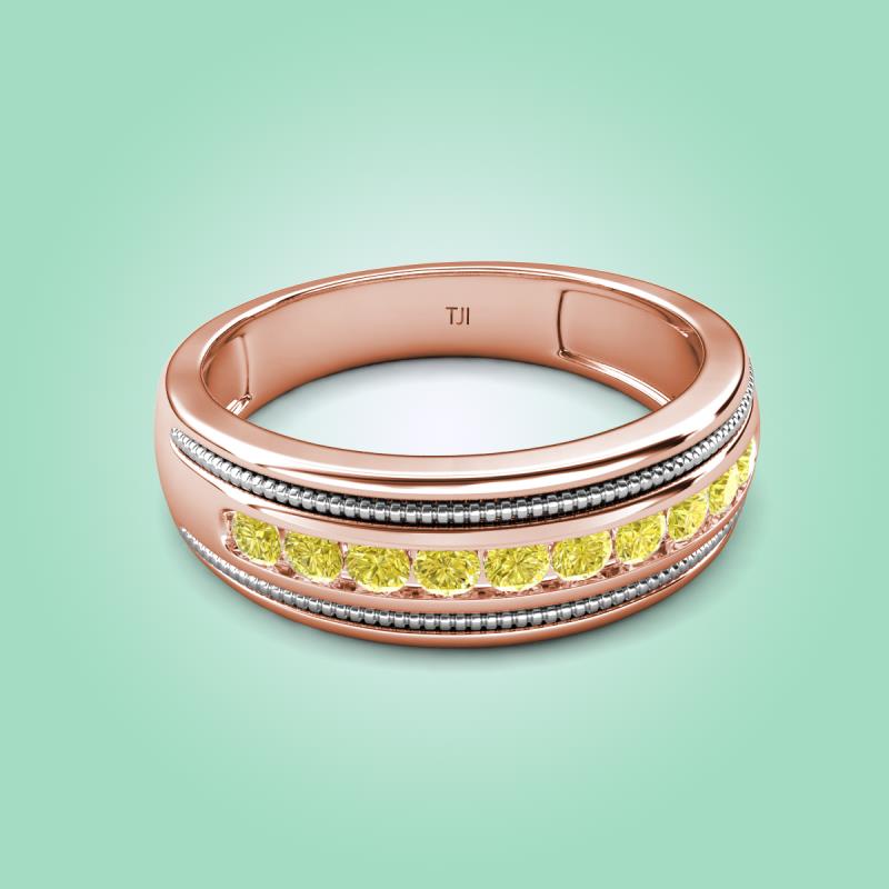 This two toned style with high polished finished edges with twisted wire effect is the best wedding band of 0.50 ctw and Round Yellow Diamond set in a Channel setting.