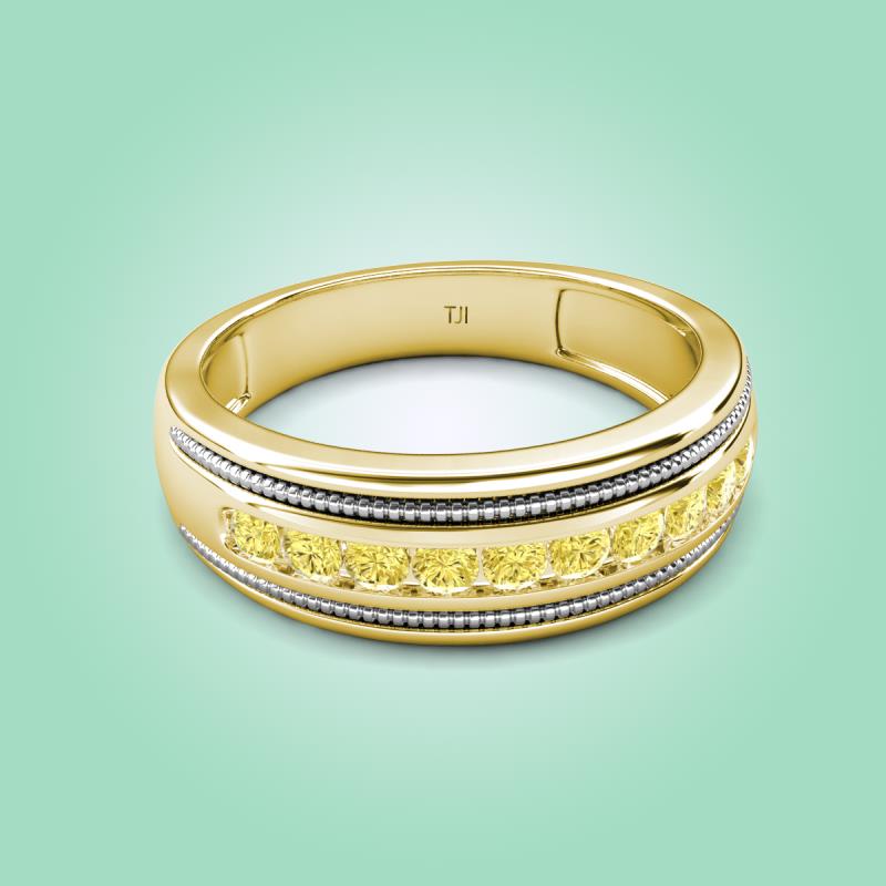 This two toned style with high polished finished edges with twisted wire effect is the best wedding band of 0.55 ctw and Round Yellow Sapphire set in a Channel setting.