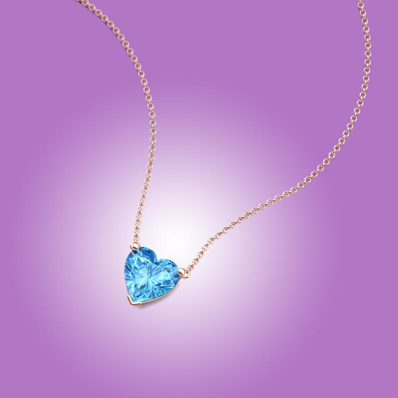 • Heart Shape Blue Topaz Soliatire Pendant Necklace in 14K Rose Gold with 16 Inches Cable Chain.