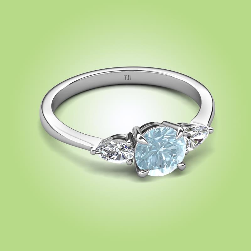 As a symbol of the beautiful journey, with this Three Stone Engagement Ring of 1.21 ctw with centre Round Aquamarine and side Pear shape Lab Grown Diamond that two people embark upon when they decide to spend their lives together.