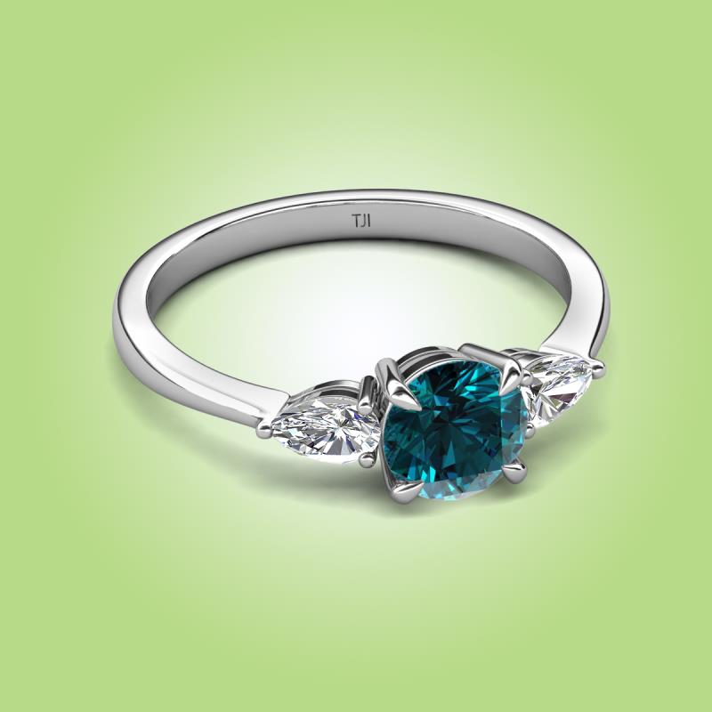 As a symbol of the beautiful journey, with this Three Stone Engagement Ring of 1.14 ctw with centre Round Blue Diamond and side Pear shape Lab Grown Diamond that two people embark upon when they decide to spend their lives together.