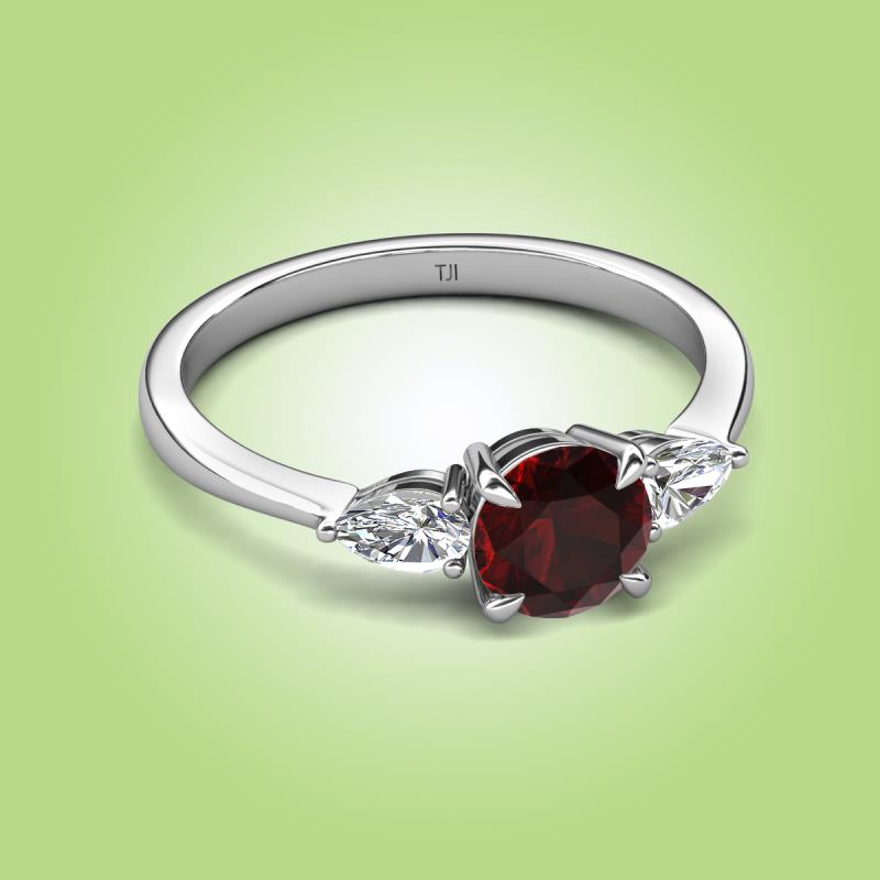 As a symbol of the beautiful journey, with this Three Stone Engagement Ring of 1.39 ctw with centre Round Red Garnet and side Pear shape Lab Grown Diamond that two people embark upon when they decide to spend their lives together.