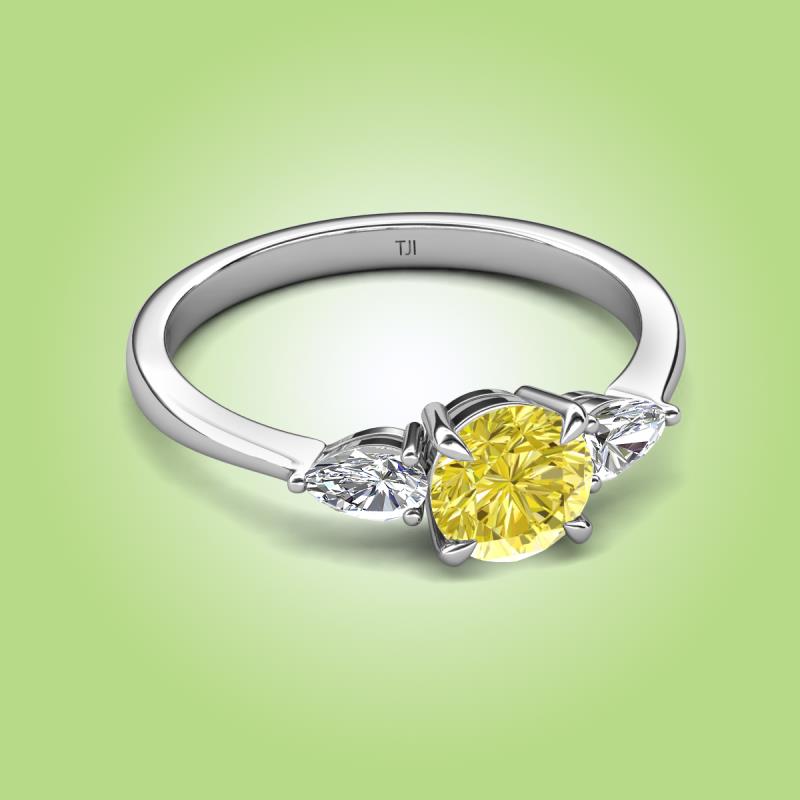 As a symbol of the beautiful journey, with this Three Stone Engagement Ring of 1.14 ctw with centre Round Yellow Diamond and side Pear shape Lab Grown Diamond that two people embark upon when they decide to spend their lives together.