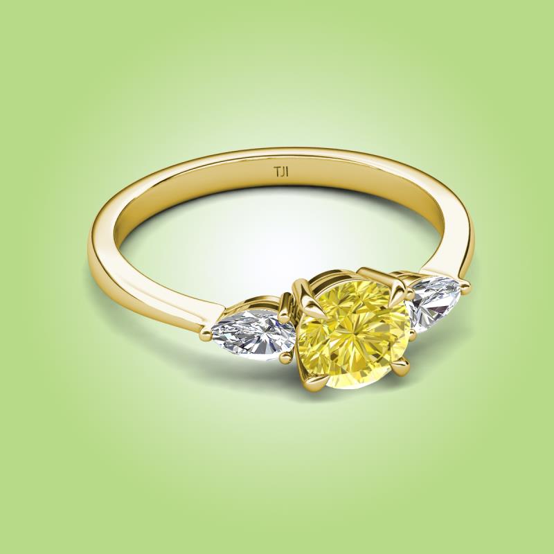 As a symbol of the beautiful journey, with this Three Stone Engagement Ring of 1.14 ctw with centre Round Yellow Diamond and side Pear shape Lab Grown Diamond that two people embark upon when they decide to spend their lives together.