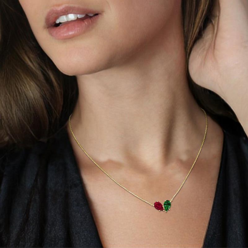 1.75 ctw Pear Shape Lab Grown Ruby and Lab Grown Emerald 2 stone Pendant Necklace in 14K Yellow Gold. Included 16 Inches 14K Yellow Gold Chain More Details ...