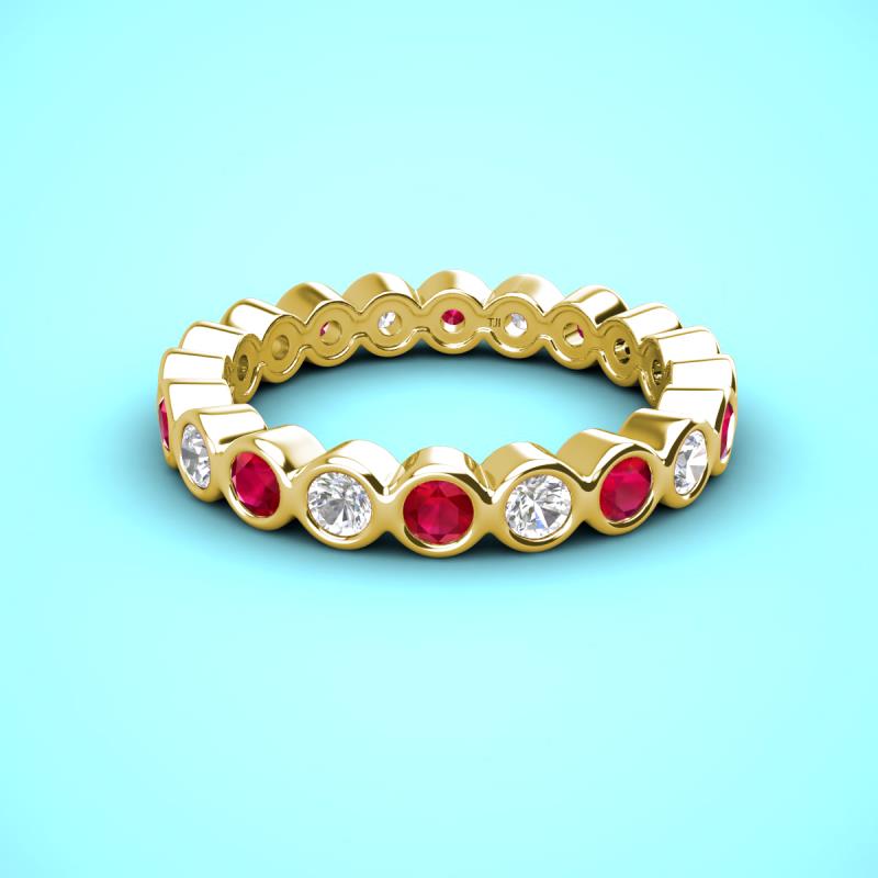 There's something about this stunning eternity band that feels incredibly romantic. This eye-catching piece is ornamented with striking Bezel set Ruby and Diamond embellised all the way around the shank. *As per ring size the stone and carat total weight changes.