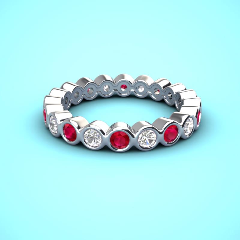 There's something about this stunning eternity band that feels incredibly romantic. This eye-catching piece is ornamented with striking Bezel set Ruby and Lab Grown Diamond embellised all the way around the shank. *As per ring size the stone and carat total weight changes.