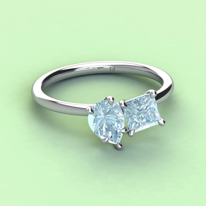 A beautiful symbol of everlasting love, this duo two-stone ring showcases a pair of Pear Shape Aquamarine shimmering alongside of a luminous Princess Shape Aquamarine crafted beautifully that represents two of you together.