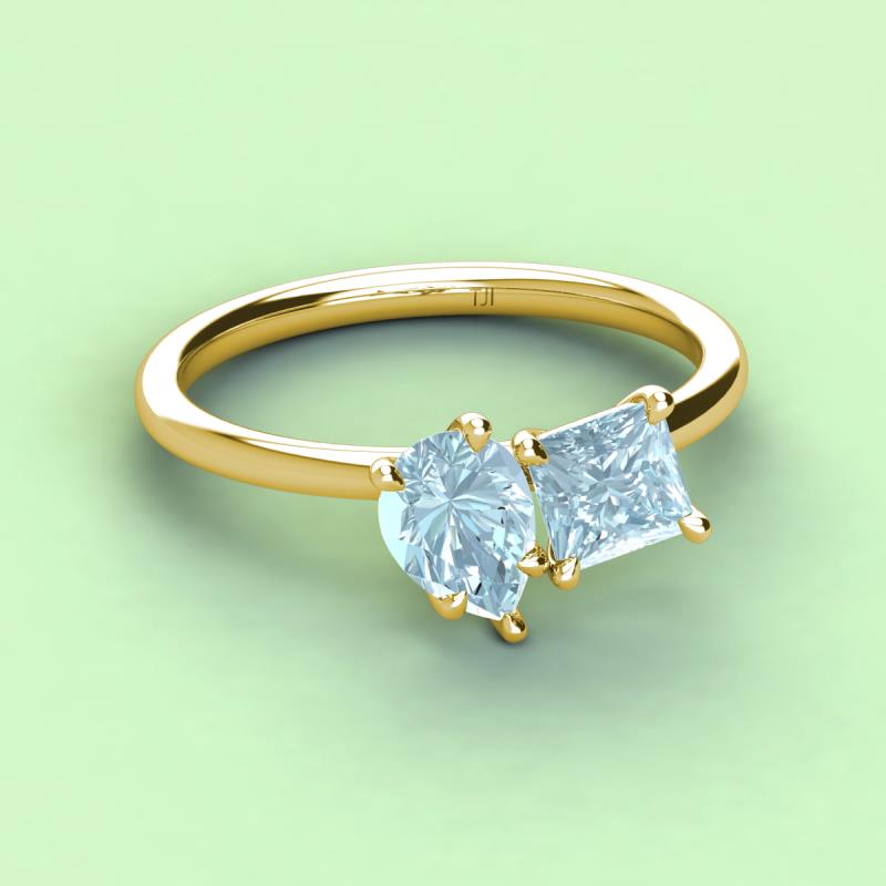 A beautiful symbol of everlasting love, this duo two-stone ring showcases a pair of Pear Shape Aquamarine shimmering alongside of a luminous Princess Shape Aquamarine crafted beautifully that represents two of you together.