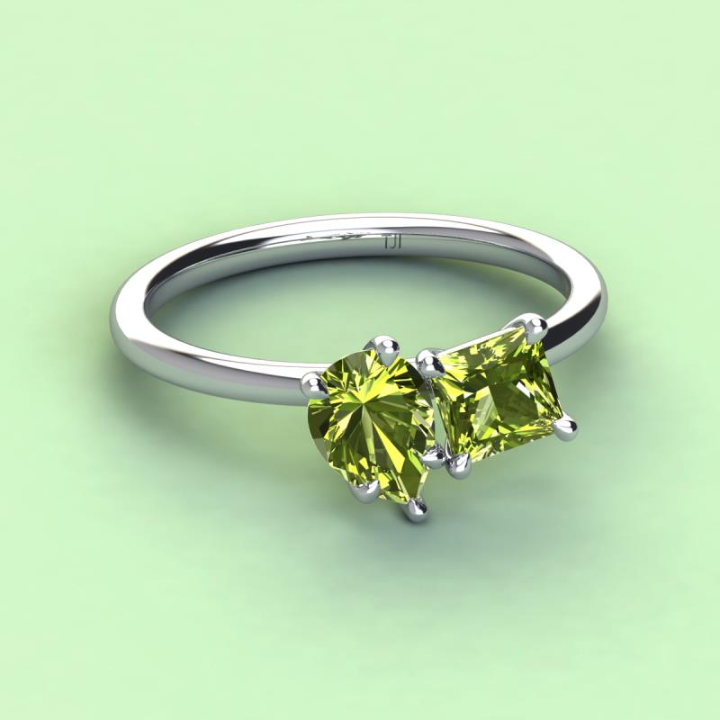 A beautiful symbol of everlasting love, this duo two-stone ring showcases a pair of Pear Shape Peridot shimmering alongside of a luminous Princess Shape Peridot crafted beautifully that represents two of you together.