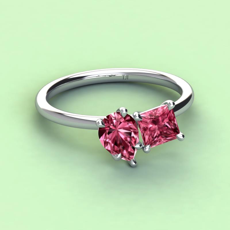 A beautiful symbol of everlasting love, this duo two-stone ring showcases a pair of Pear Shape Pink Tourmaline shimmering alongside of a luminous Princess Shape Pink Tourmaline crafted beautifully that represents two of you together.
