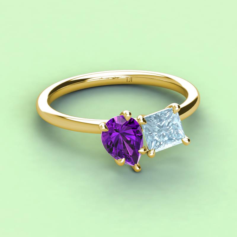 A beautiful symbol of everlasting love, this duo two-stone ring showcases a pair of Pear Shape Amethyst shimmering alongside of a luminous Princess Shape Aquamarine crafted beautifully that represents two of you together.