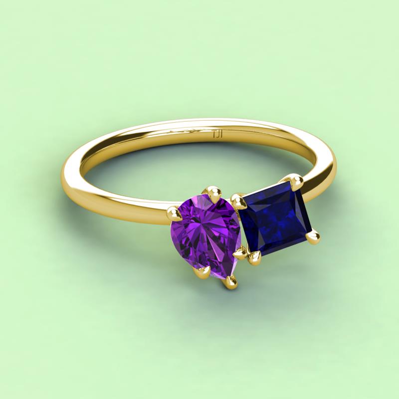 A beautiful symbol of everlasting love, this duo two-stone ring showcases a pair of Pear Shape Amethyst shimmering alongside of a luminous Princess Shape Lab Created Blue Sapphire crafted beautifully that represents two of you together.