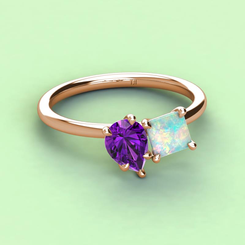A beautiful symbol of everlasting love, this duo two-stone ring showcases a pair of Pear Shape Amethyst shimmering alongside of a luminous Princess Shape Lab Created Opal crafted beautifully that represents two of you together.