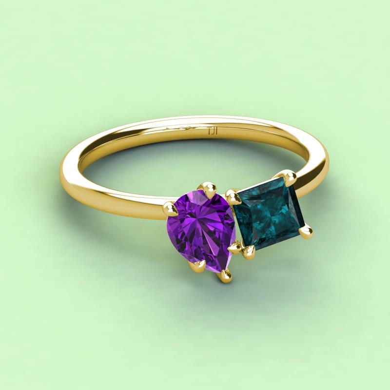 A beautiful symbol of everlasting love, this duo two-stone ring showcases a pair of Pear Shape Amethyst shimmering alongside of a luminous Princess Shape London Blue Topaz crafted beautifully that represents two of you together.