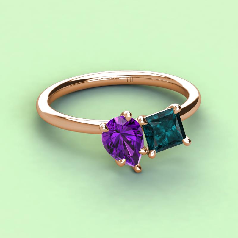 A beautiful symbol of everlasting love, this duo two-stone ring showcases a pair of Pear Shape Amethyst shimmering alongside of a luminous Princess Shape London Blue Topaz crafted beautifully that represents two of you together.
