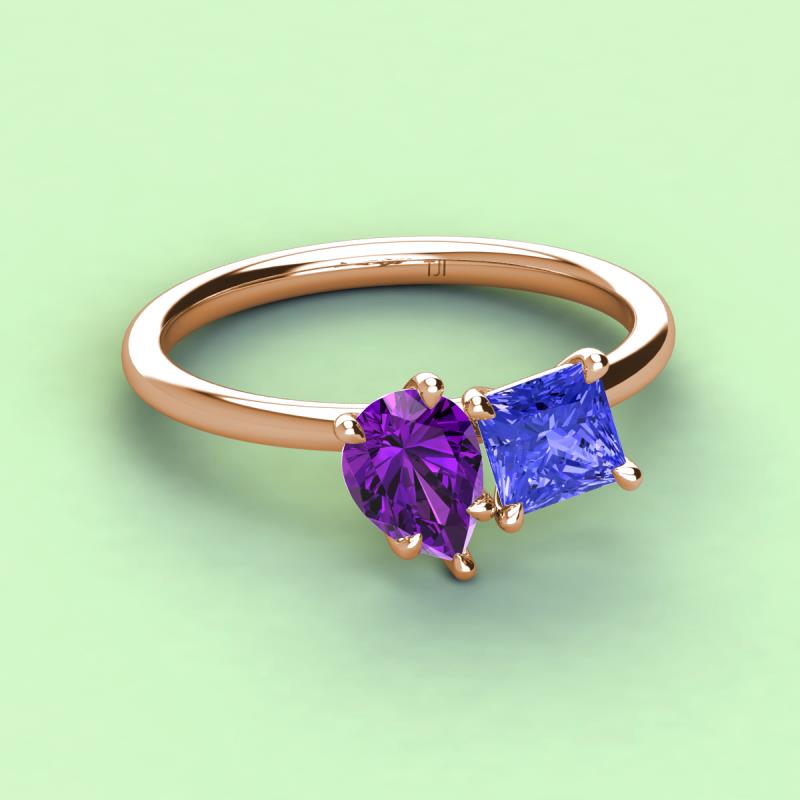 A beautiful symbol of everlasting love, this duo two-stone ring showcases a pair of Pear Shape Amethyst shimmering alongside of a luminous Princess Shape Tanzanite crafted beautifully that represents two of you together.