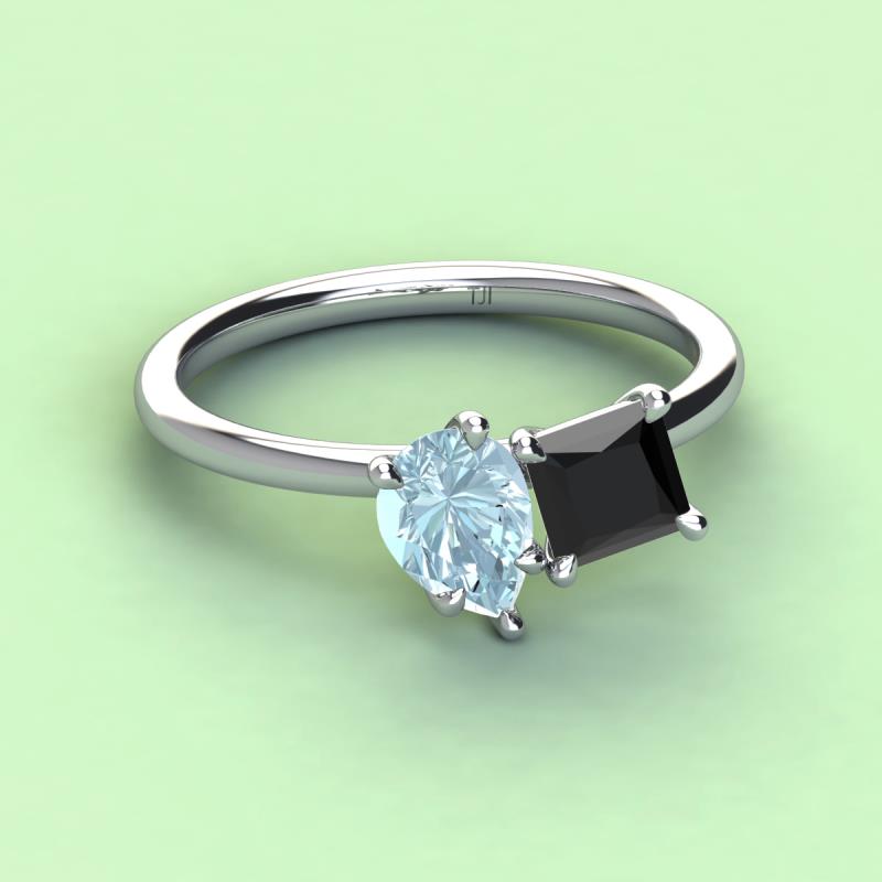 A beautiful symbol of everlasting love, this duo two-stone ring showcases a pair of Pear Shape Aquamarine shimmering alongside of a luminous Princess Shape Black Diamond crafted beautifully that represents two of you together.