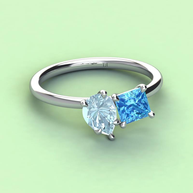A beautiful symbol of everlasting love, this duo two-stone ring showcases a pair of Pear Shape Aquamarine shimmering alongside of a luminous Princess Shape Blue Topaz crafted beautifully that represents two of you together.