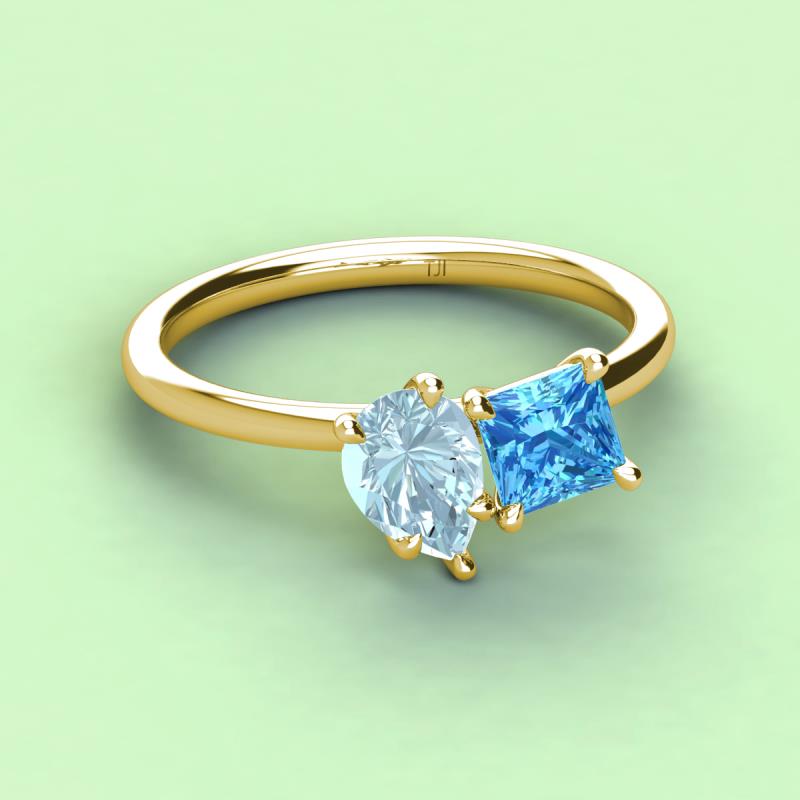 A beautiful symbol of everlasting love, this duo two-stone ring showcases a pair of Pear Shape Aquamarine shimmering alongside of a luminous Princess Shape Blue Topaz crafted beautifully that represents two of you together.