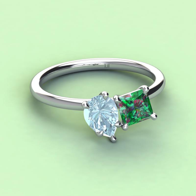 A beautiful symbol of everlasting love, this duo two-stone ring showcases a pair of Pear Shape Aquamarine shimmering alongside of a luminous Princess Shape Lab Created Alexandrite crafted beautifully that represents two of you together.