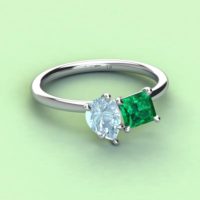 A beautiful symbol of everlasting love, this duo two-stone ring showcases a pair of Pear Shape Aquamarine shimmering alongside of a luminous Princess Shape Lab Created Emerald crafted beautifully that represents two of you together.