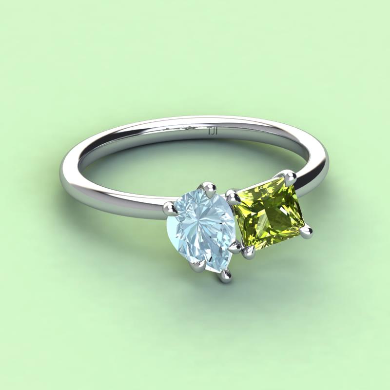 A beautiful symbol of everlasting love, this duo two-stone ring showcases a pair of Pear Shape Aquamarine shimmering alongside of a luminous Princess Shape Peridot crafted beautifully that represents two of you together.