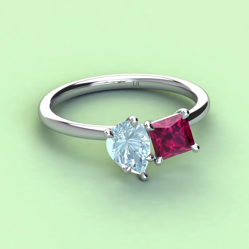 A beautiful symbol of everlasting love, this duo two-stone ring showcases a pair of Pear Shape Aquamarine shimmering alongside of a luminous Princess Shape Rhodolite Garnet crafted beautifully that represents two of you together.