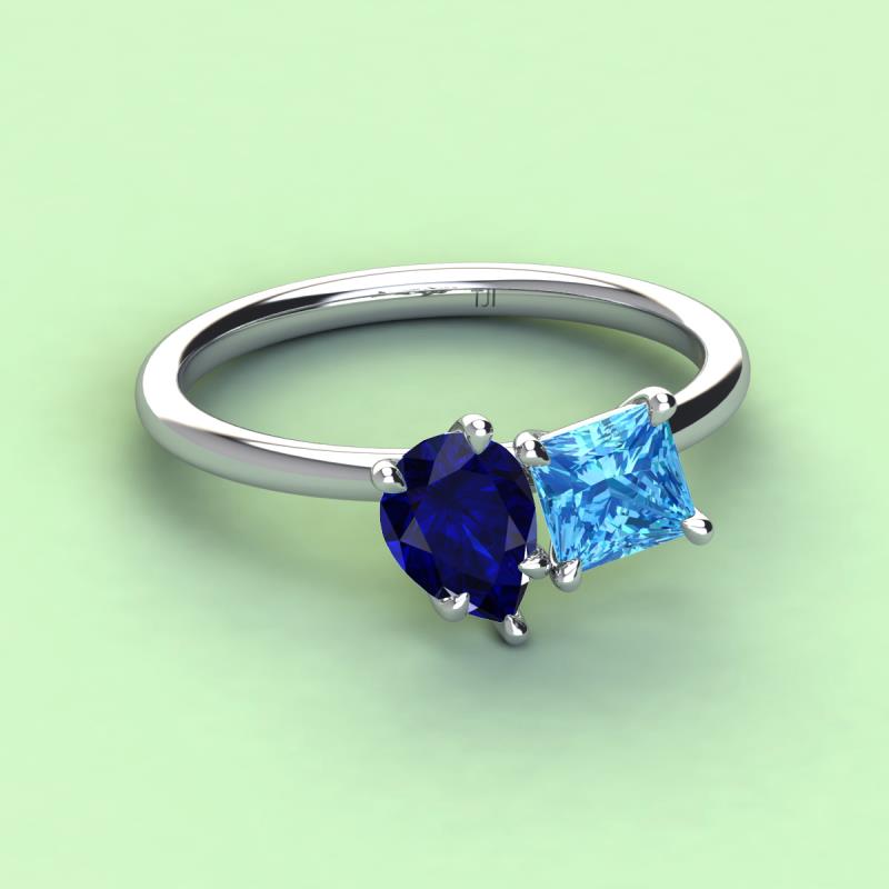 A beautiful symbol of everlasting love, this duo two-stone ring showcases a pair of Pear Shape Blue Sapphire shimmering alongside of a luminous Princess Shape Blue Topaz crafted beautifully that represents two of you together.