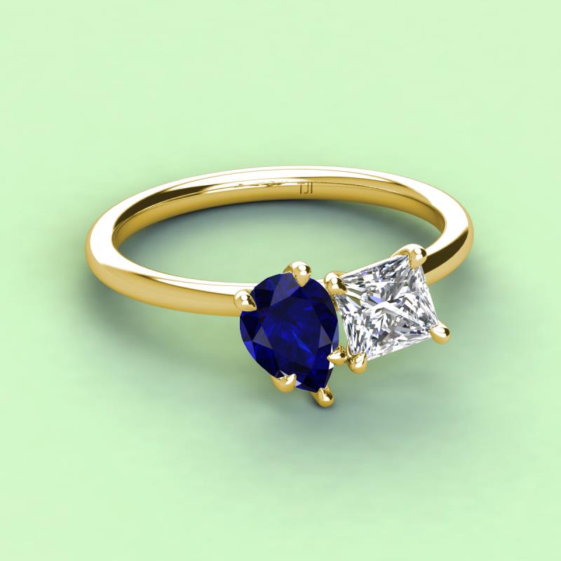 A beautiful symbol of everlasting love, this duo two-stone ring showcases a pair of Pear Shape Blue Sapphire shimmering alongside of a luminous Princess Shape IGI Certified Lab Grown Diamond crafted beautifully that represents two of you together.