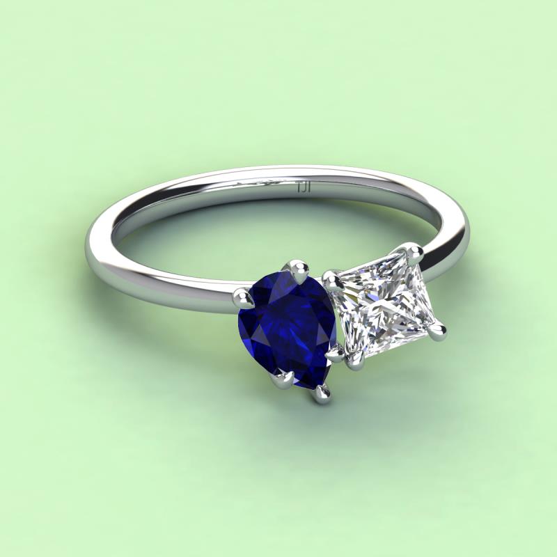 A beautiful symbol of everlasting love, this duo two-stone ring showcases a pair of Pear Shape Blue Sapphire shimmering alongside of a luminous Princess Shape IGI Certified Lab Grown Diamond crafted beautifully that represents two of you together.