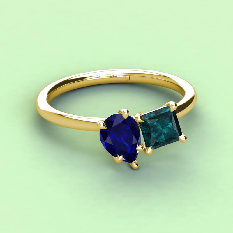 A beautiful symbol of everlasting love, this duo two-stone ring showcases a pair of Pear Shape Blue Sapphire shimmering alongside of a luminous Princess Shape London Blue Topaz crafted beautifully that represents two of you together.