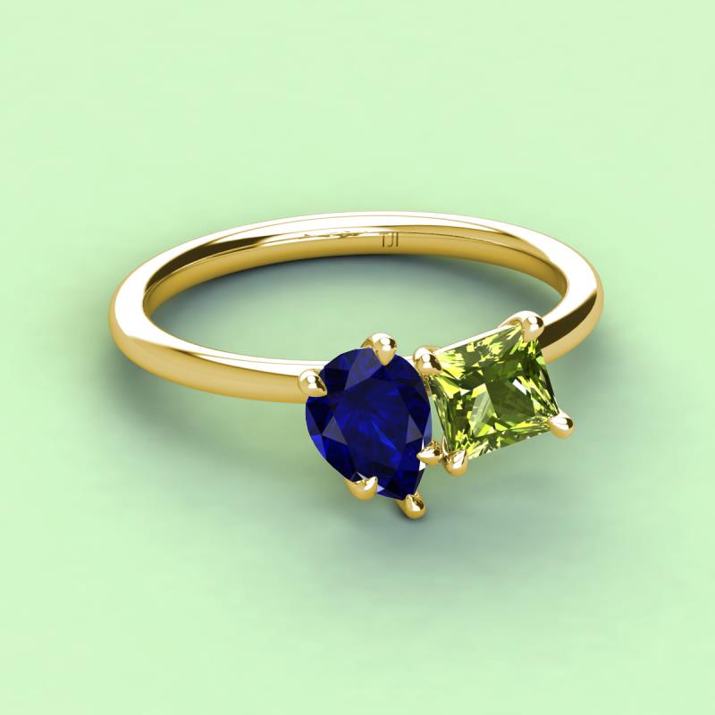 A beautiful symbol of everlasting love, this duo two-stone ring showcases a pair of Pear Shape Blue Sapphire shimmering alongside of a luminous Princess Shape Peridot crafted beautifully that represents two of you together.