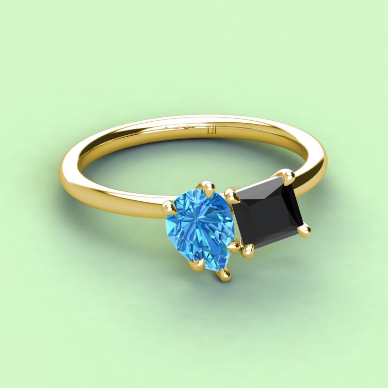 A beautiful symbol of everlasting love, this duo two-stone ring showcases a pair of Pear Shape Blue Topaz shimmering alongside of a luminous Princess Shape Black Diamond crafted beautifully that represents two of you together.