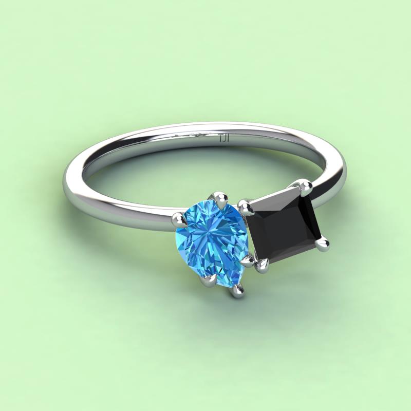 A beautiful symbol of everlasting love, this duo two-stone ring showcases a pair of Pear Shape Blue Topaz shimmering alongside of a luminous Princess Shape Black Diamond crafted beautifully that represents two of you together.