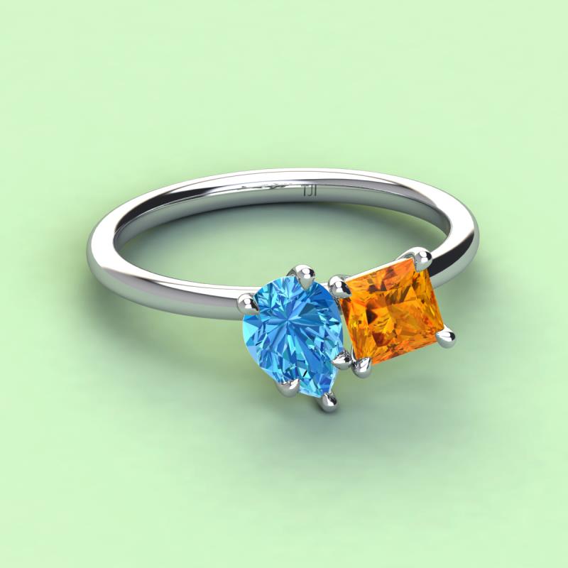 A beautiful symbol of everlasting love, this duo two-stone ring showcases a pair of Pear Shape Blue Topaz shimmering alongside of a luminous Princess Shape Citrine crafted beautifully that represents two of you together.