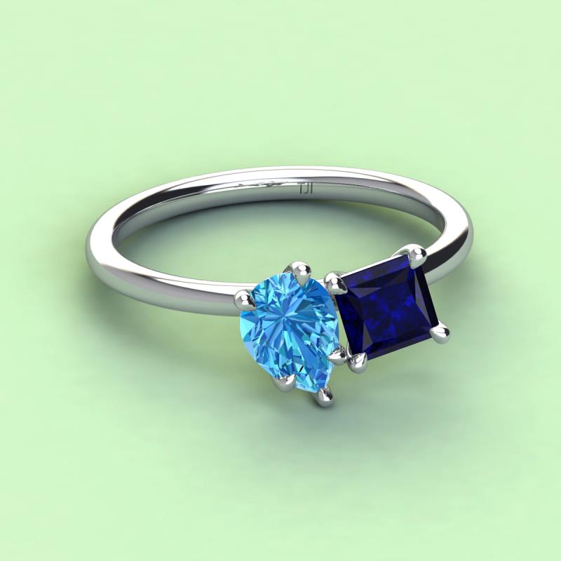 A beautiful symbol of everlasting love, this duo two-stone ring showcases a pair of Pear Shape Blue Topaz shimmering alongside of a luminous Princess Shape Lab Created Blue Sapphire crafted beautifully that represents two of you together.