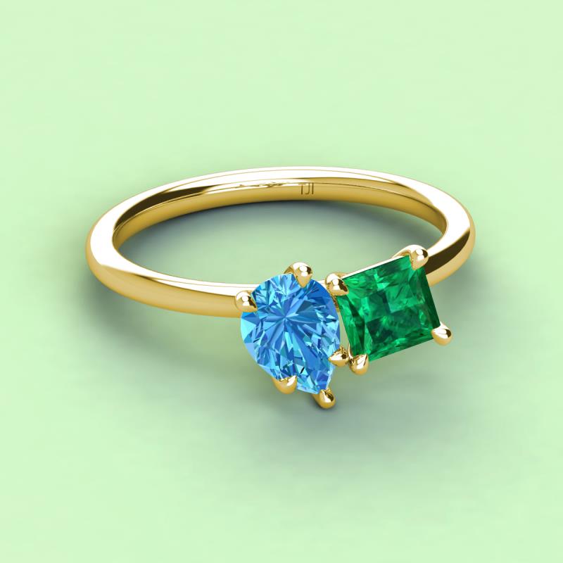 A beautiful symbol of everlasting love, this duo two-stone ring showcases a pair of Pear Shape Blue Topaz shimmering alongside of a luminous Princess Shape Lab Created Emerald crafted beautifully that represents two of you together.